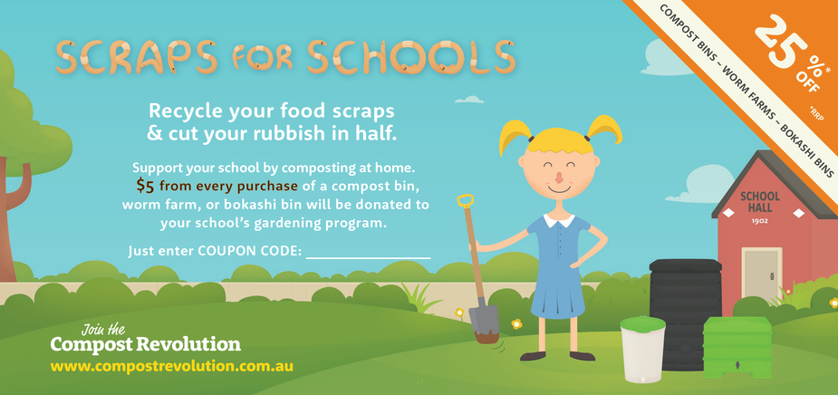 This is where Scraps for Schools comes in. As kids get skilled up at school, why not bring their skills to life to make a difference at home? Simply grab a compost bin, worm farm or bokashi bin for upto 40% off the retail price to start a tradition at home that will pass down through the generations. And for every bin or farm you get, we'll donate money to a school of your choice!